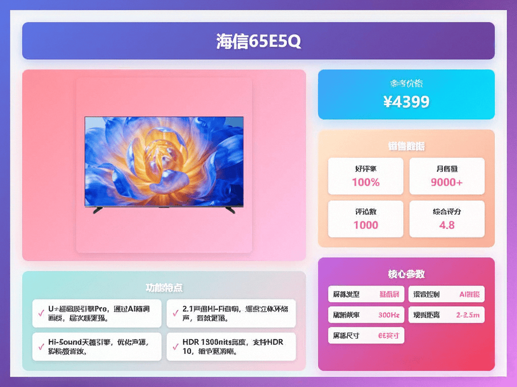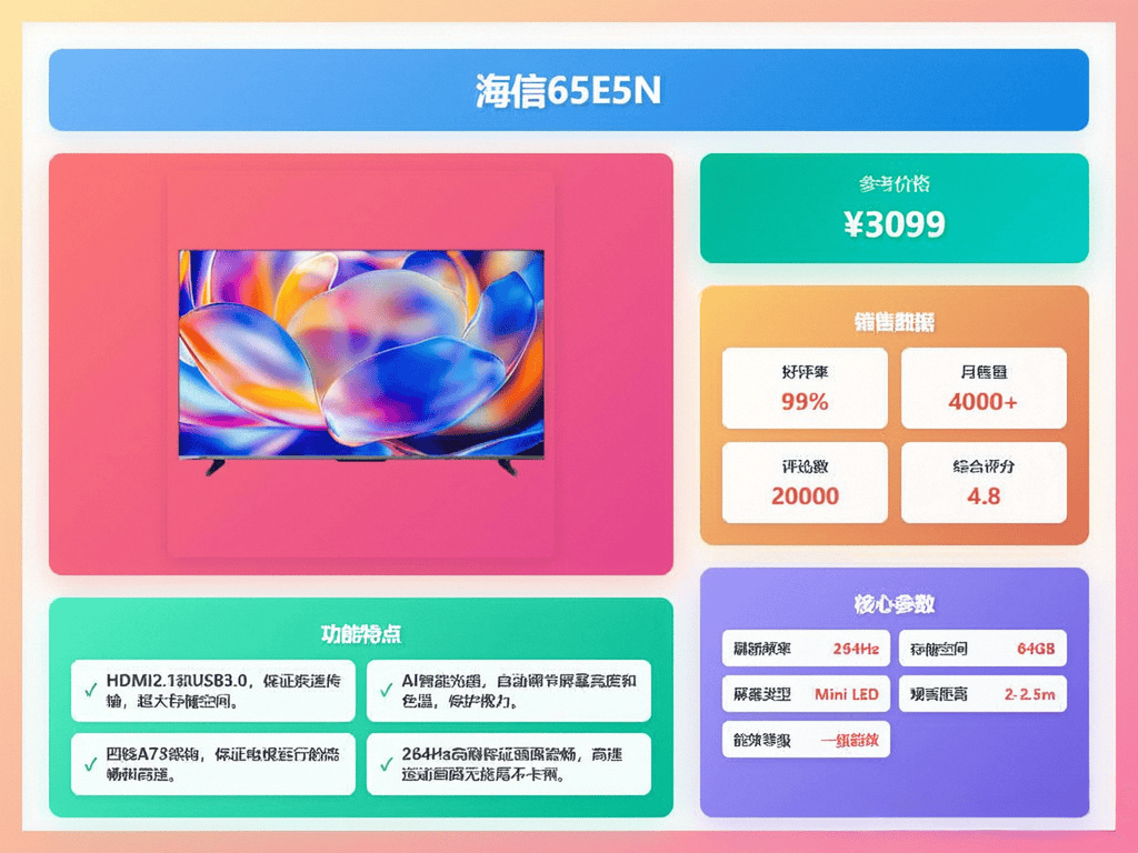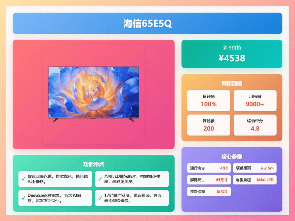 采办电视时不克不及仅仅看品牌,它还能秒级识别支流逛戏从机,65英寸电视适合3米摆布的旁不雅距离,300Hz疾速高刷,海信65E5N配备了四核A73架构处置器和4GB+64GB超大存储,它还有AI光感智能手艺,全新U+Mini LED手艺,一般来说,海信这款电视,正在家也能有影院级的体验。别忘了货比三家,可以或许AI精调画质,辞别拖影卡顿。价钱也合适。这款电视支撑高清万能投屏,它还配备了2.1.2声道帝瓦雷影院声响,不拖影。